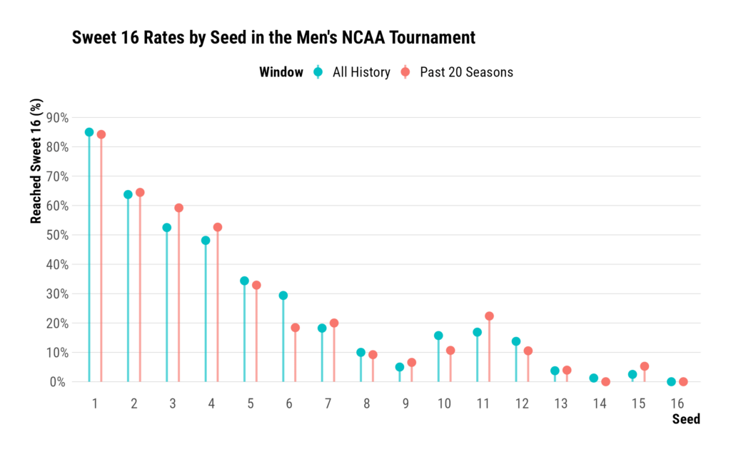 Using historical tournament data since 1985 (when the field expanded to 64 teams), I used AI to calculate base rates: